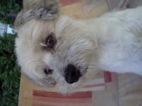 Szany egy játékos, aranyos kiskutya. 7 éves május 25.-én született. Kis termete és fehér színű szőre fülén barnás foltok vannak. Szereti a hasát. És én nagyon szeretem.